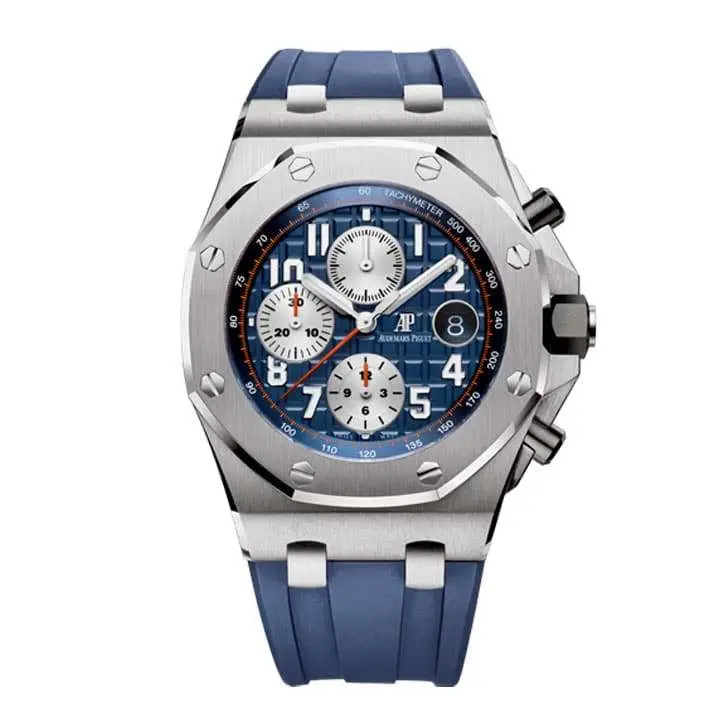 The Audemars Piguet Royal Oak Offshore Chronograph is a bold and modern reinterpretation of the classic Royal Oak. This luxury sports watch features a robust stainless steel case paired with a vibrant blue rubber strap for both style and durability. The blue dial, enhanced with a “Méga Tapisserie” pattern, showcases three silver sub-dials, red accents, and luminous hands, offering excellent legibility and a dynamic aesthetic.