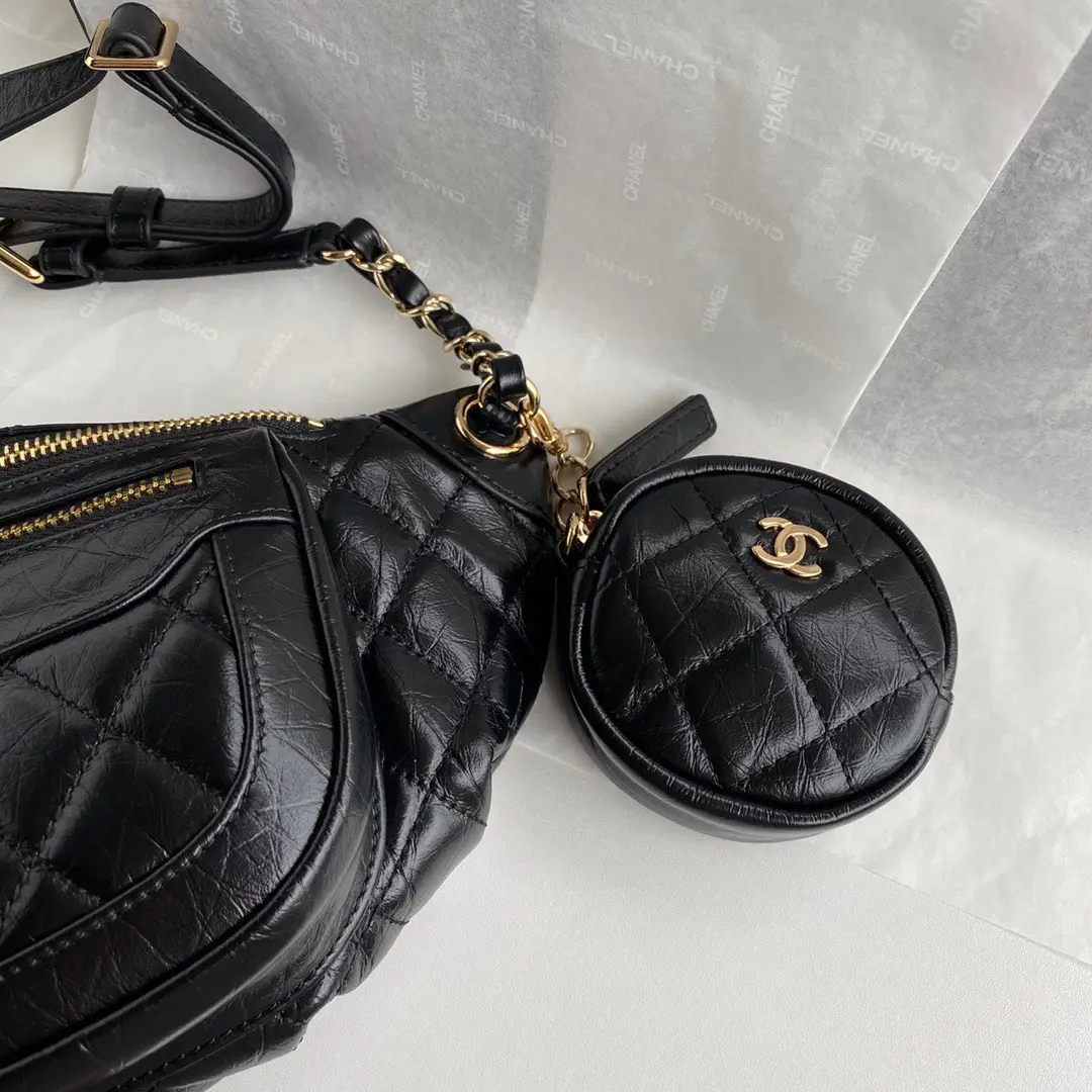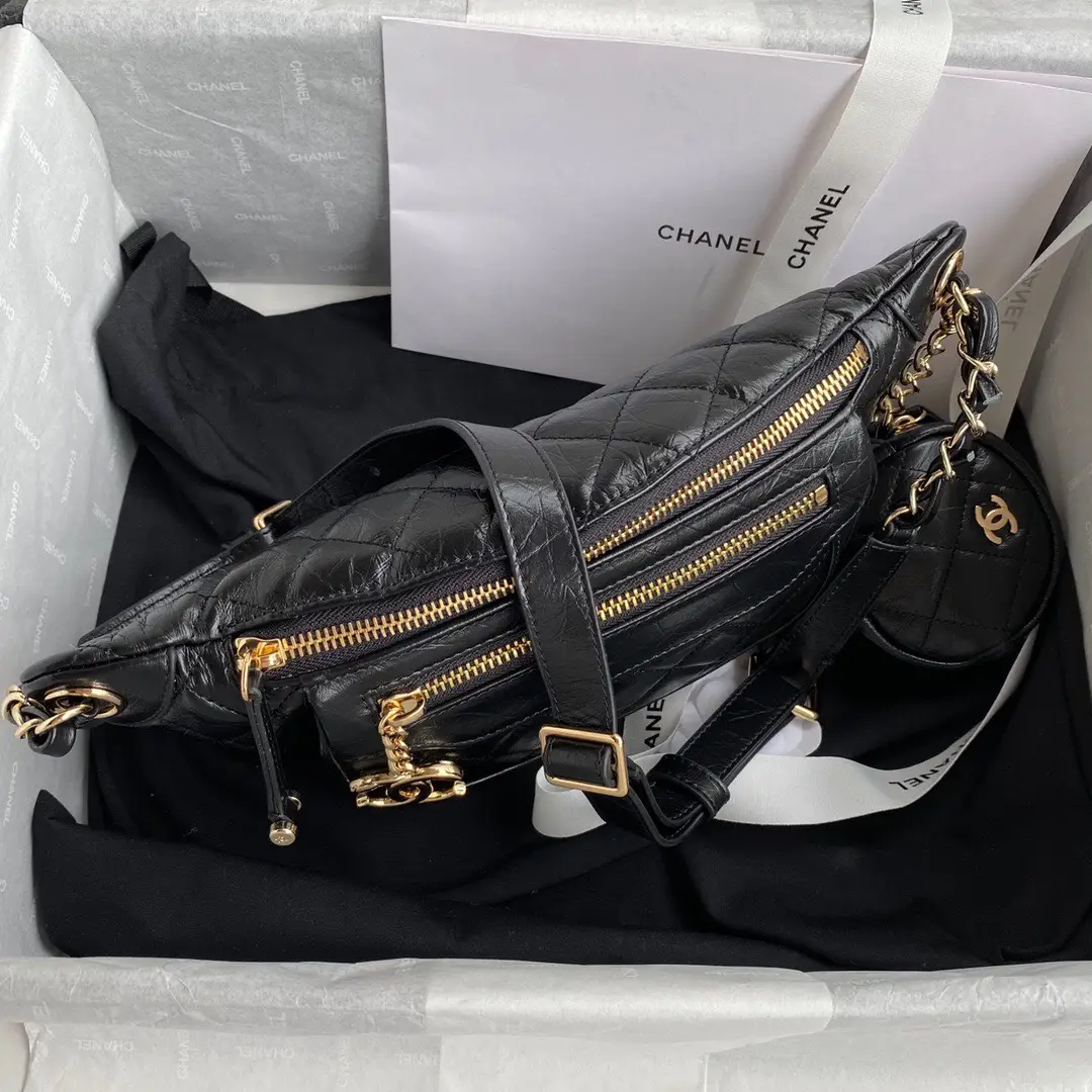 Chanel Bumbag Black Wrinkled Leather Lock Gold Handbags 34x15x6cm